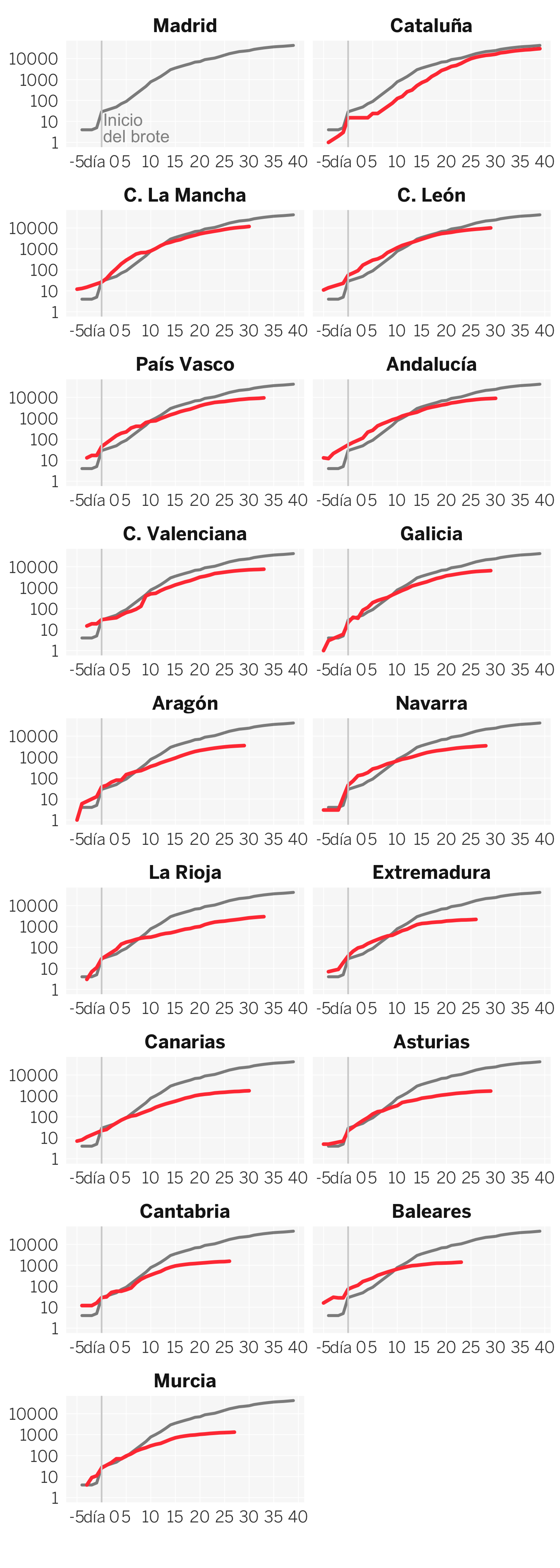 Inicio del brote. Para fijar la fecha del inicio del brote de cada país hemos tomado el primer día que se registraron 20 casos nuevos. Para los brotes de las comunidades hemos tomado el primer día con 10 casos nuevos.