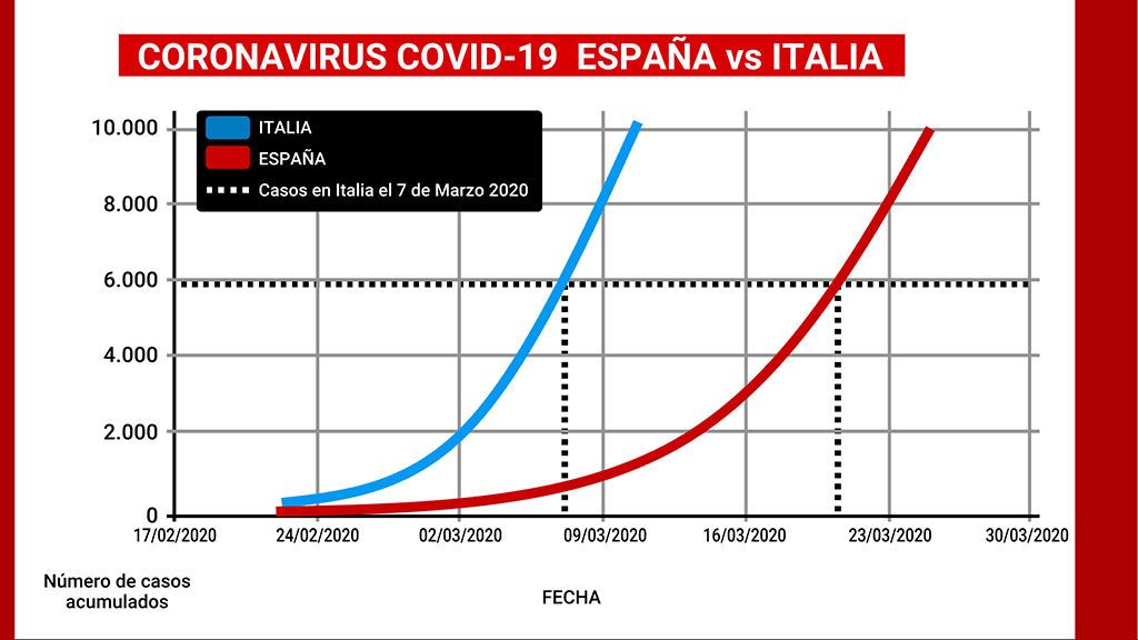 Si España sigue el mismo patrón del contagios que hemos visto en Italia con el Coronavirus, el número de infectados por el Covid-19 podría superar los 6.000 casos entorno al 21 de marzo. La cifra supondría multiplicar por seis el número actual de infectados en tan solo doce días.