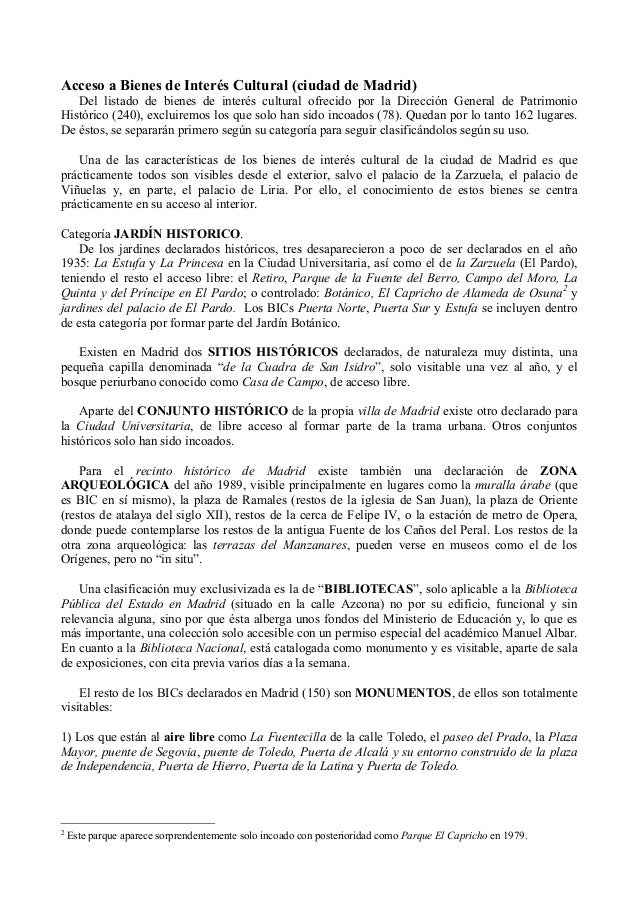 - En cuanto a la Biblioteca Nacional, está catalogada como monumento y es visitable, aparte de sala de exposiciones, con cita previa varios días a la semana. El resto de los BICs declarados en Madrid (150) son MONUMENTOS, de ellos son totalmente visitables: