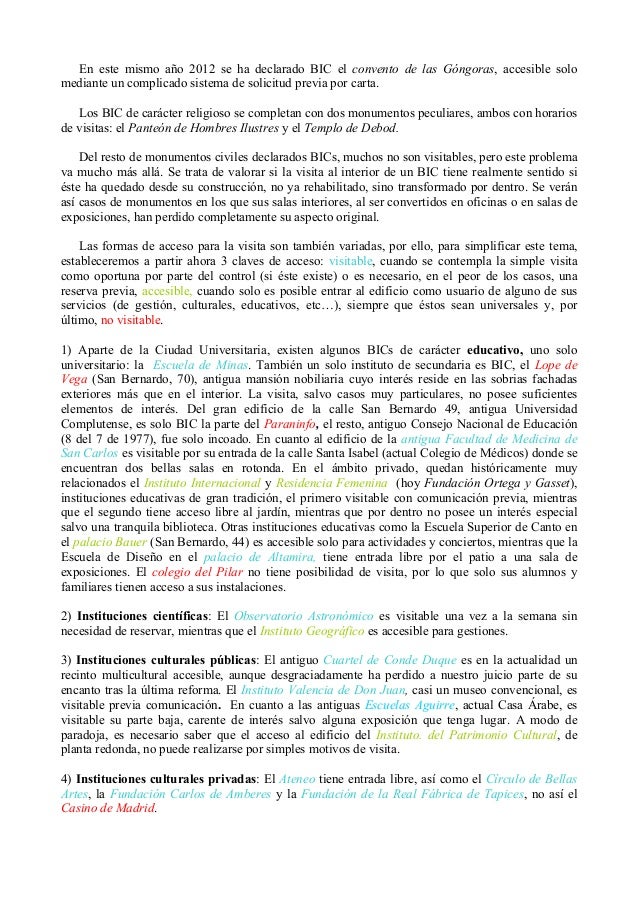 - 4. En este mismo año 2012 se ha declarado BIC el convento de las Góngoras, accesible solo mediante un complicado sistema de solicitud previa por carta. Los BIC de carácter religioso se completan con dos monumentos peculiares, ambos con horarios de visitas: el Panteón de Hombres Ilustres y el Templo de Debod. Del resto de monumentos civiles declarados BICs, muchos no son visitables, pero este problema va mucho más allá.