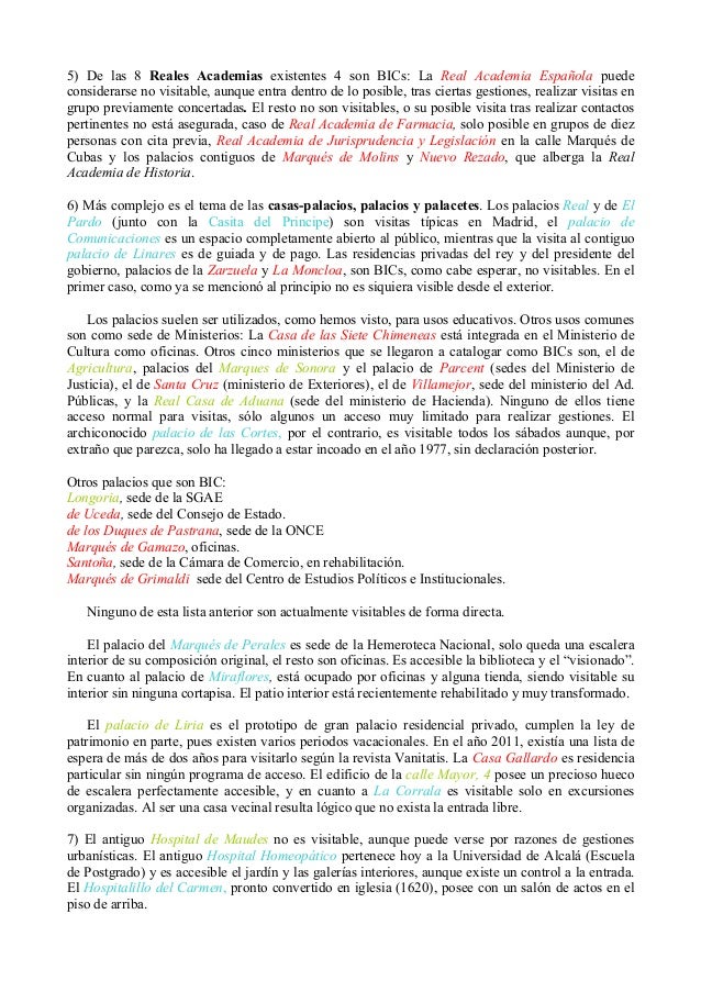 - 5. 5) De las 8 Reales Academias existentes 4 son BICs: La Real Academia Española puedeconsiderarse no visitable, aunque entra dentro de lo posible, tras ciertas gestiones, realizar visitas en grupo previamente concertadas. El resto no son visitables, o su posible visita tras realizar contactos pertinentes no está asegurada, caso de Real Academia de Farmacia, solo posible en grupos de diez personas con cita previa, Real Academia de Jurisprudencia y Legislación en la calle Marqués de Cubas y los palacios contiguos de Marqués de Molins y Nuevo Rezado, que alberga la Real Academia de Historia.