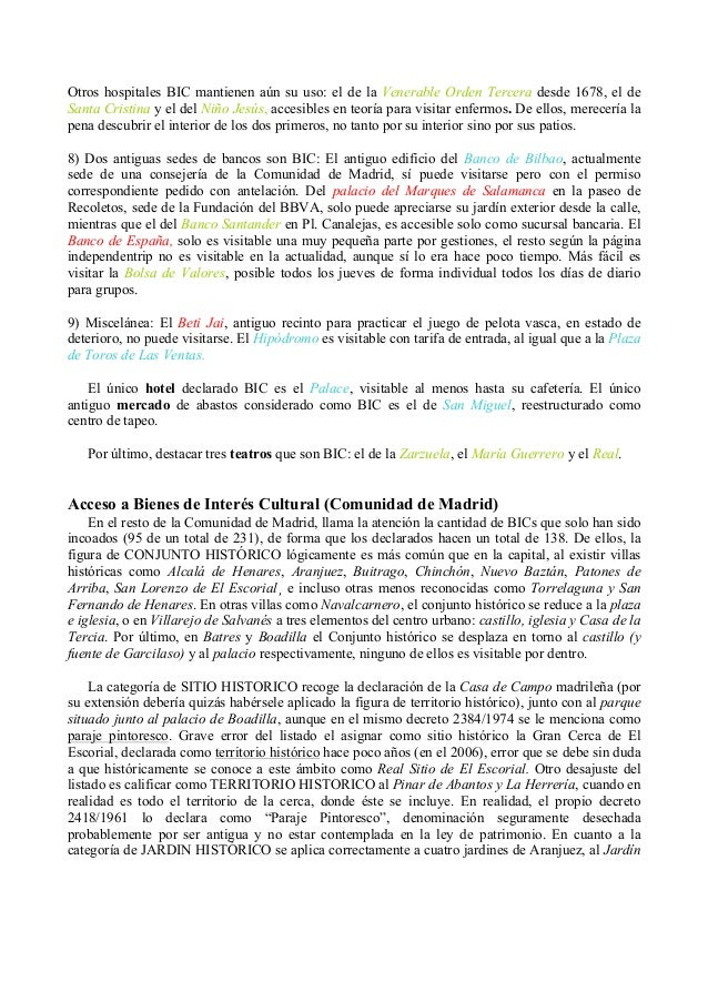 - El punto 2 de este artículo dice: "Asimismo los propietarios y en su caso los titulares de derechos reales sobre tales bienes etc... están obligados a permitir y facilitar su inspección por parte de los organismos competentes,su estudio a los investigadores previa solicitud razonada de éstos y su visita pública, en las condiciones de gratuidad que se determinen reglamentariamente, al menos cuatro días al mes, en días y horas previamente señalados... Se entiende, pues, que un inmueble o lugar declarado BIC, no solo podrá, sino que deberá disponer de un horario de visitas al menos una vez a la semana, salvo dispensaciones aprobadas por la D.G. de Patrimonio Histórico en el caso de la Comunidad de Madrid