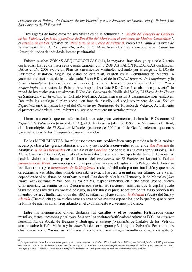 - 7. existente en el Palacio de Cadalso de los Vidrios 4 y a los Jardines de Monasterio (y Palacio) de San Lorenzo de El Escorial. Tres lugares de todos éstos no son visitables en la actualidad: el Jardín del Palacio de Cadalso de los Vidrios, el palacio y jardines de Boadilla del Monte con el convento de Madres Carmelitas”,el castillo de Batres y partes del Real Sitio de la Cerca de Felipe II, como La Granjilla, interior dela casa-fortaleza de El Campillo, palacio de Monesterio (los tres incoados) o el Canto de Castrejón, todos de indudable interés patrimonial.