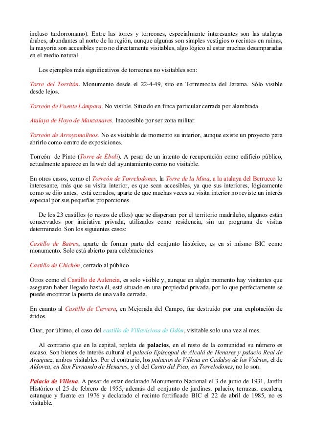 - 8. incluso tardorromano). Entre las torres y torreones, especialmente interesantes son las atalayas árabes, abundantes al norte de la región, aunque algunas son simples vestigios o recintos en ruinas,la mayoría son accesibles pero no directamente visitables, algo lógico al estar muchas desamparadas en el medio natural. Los ejemplos más significativos de torreones no visitables son:Torre del Torritón. Monumento desde el 22-4-49, sito en Torremocha del Jarama. Sólo visible desde lejos.Torreón de Fuente Lámpara.